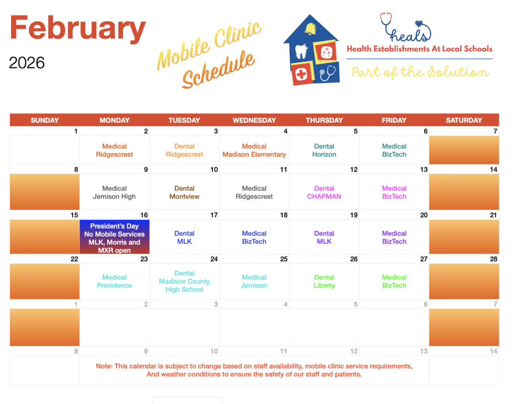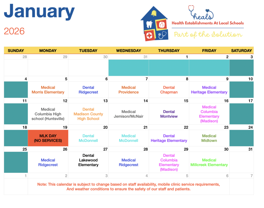Thanks to our incredible community partners Frank J. Williams, The Madison County Commission, The Church of Jesus Christ of Latter-day Saints, and TARCOG – HEALS, Inc. has secured a state-of-the-art mobile medical and dental clinic, which will further enhance our ability to reach children living in poverty throughout Madison County. The mobile clinic will travel to various schools during the academic year, rural parts of the county, and to lower-income neighborhoods, making comprehensive health services accessible to those who need it most.